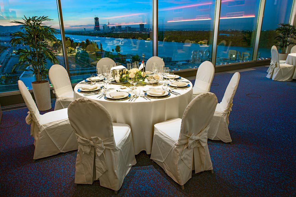 Durch die breite Fensterfront genießen Sie einen weiten Ausblick über die Donau-Skyline, die Donauinsel, das Praterstadion, das Riesenrad und viele weitere bekannte Sehenswürdigkeiten.